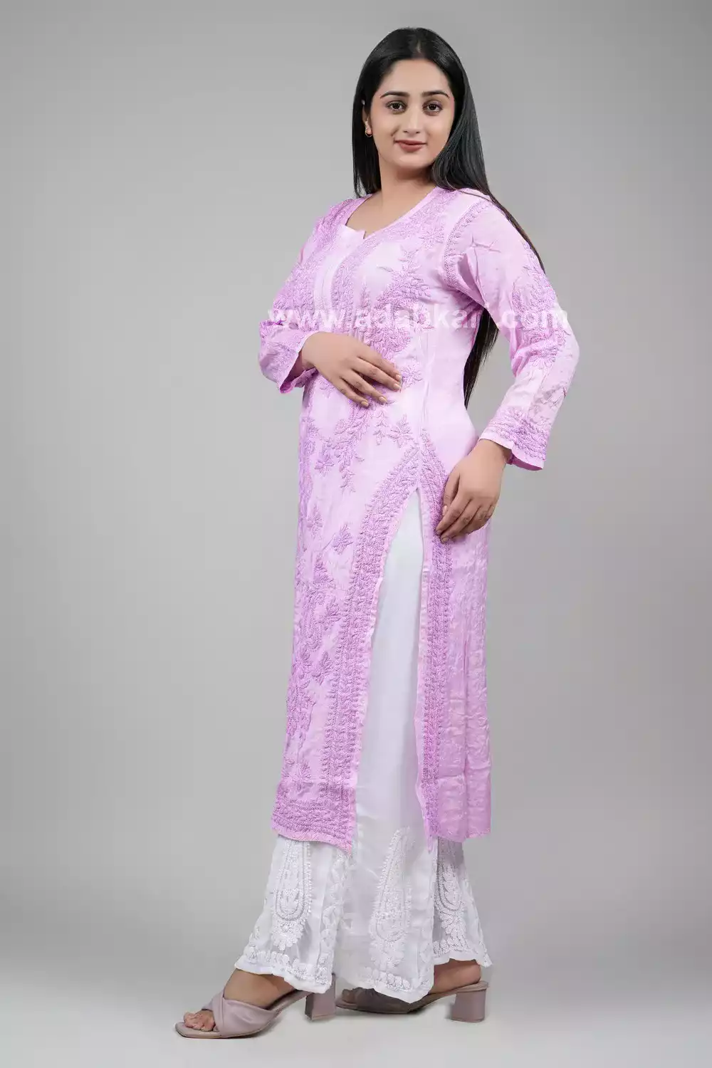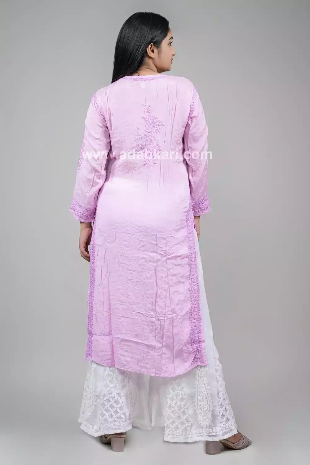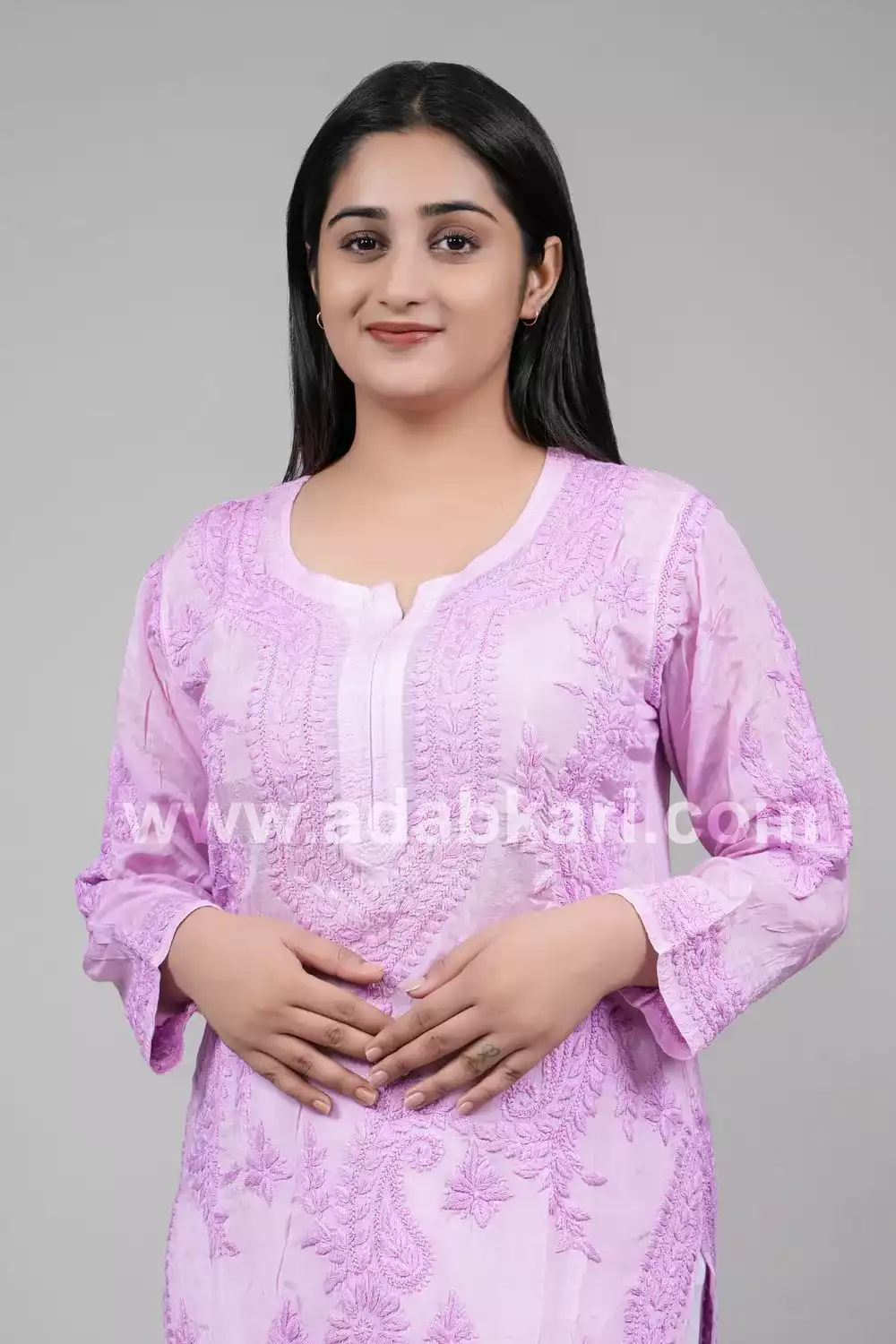 Aakriti, Purple colour fine work long kurti with purple colour thread hand embroided. It is 100% heavy and hand-embroidered on the front, back, and sleeves Experience the wonder of our premium kurti for a classic, relaxed fit. Its timeless aesthetic adds a tasteful touch of sophistication to your wardrobe, imbuing every outfit with a touch of elegance and exclusivity.
