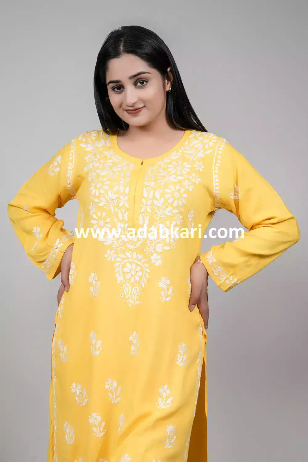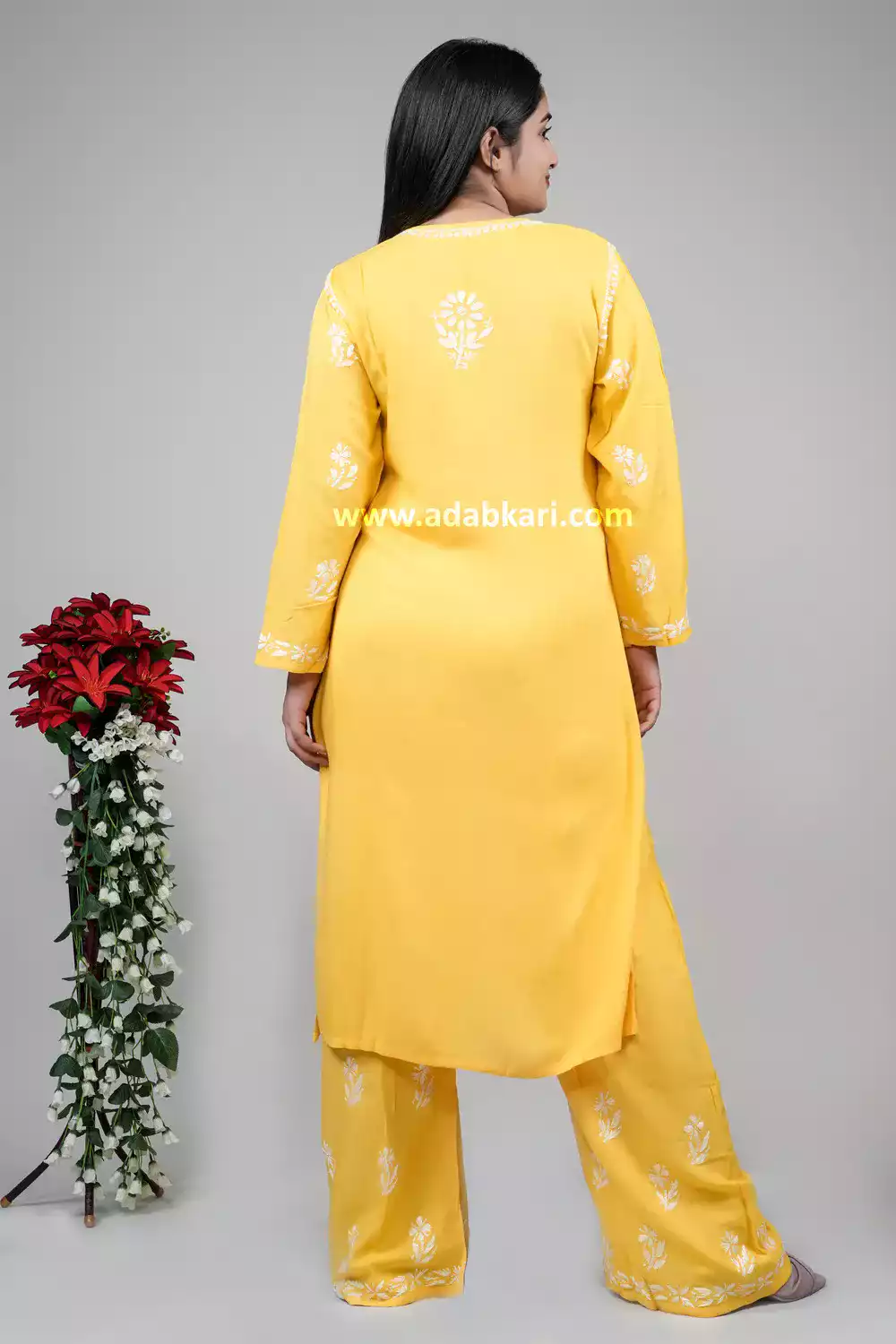Rasam, Yellow colour fine work long kurti with plazzo set with white thread hand embroided. It is 100% heavy and hand-embroidered on the front, back, and sleeves Experience the wonder of our premium kurti for a classic, relaxed fit. Its timeless aesthetic adds a tasteful touch of sophistication to your wardrobe, imbuing every outfit with a touch of elegance and exclusivity.