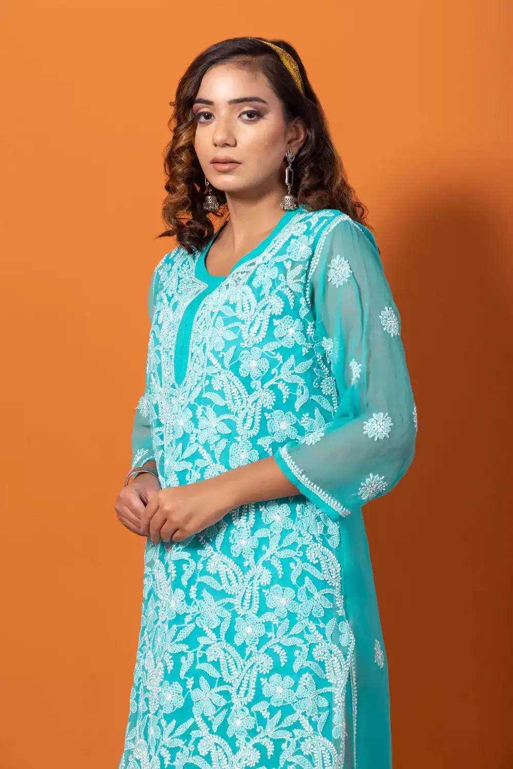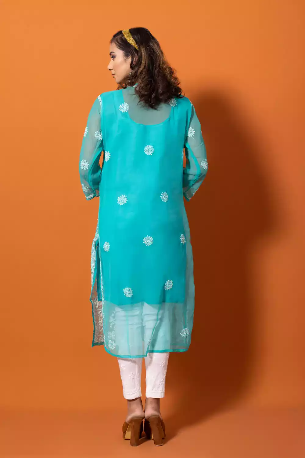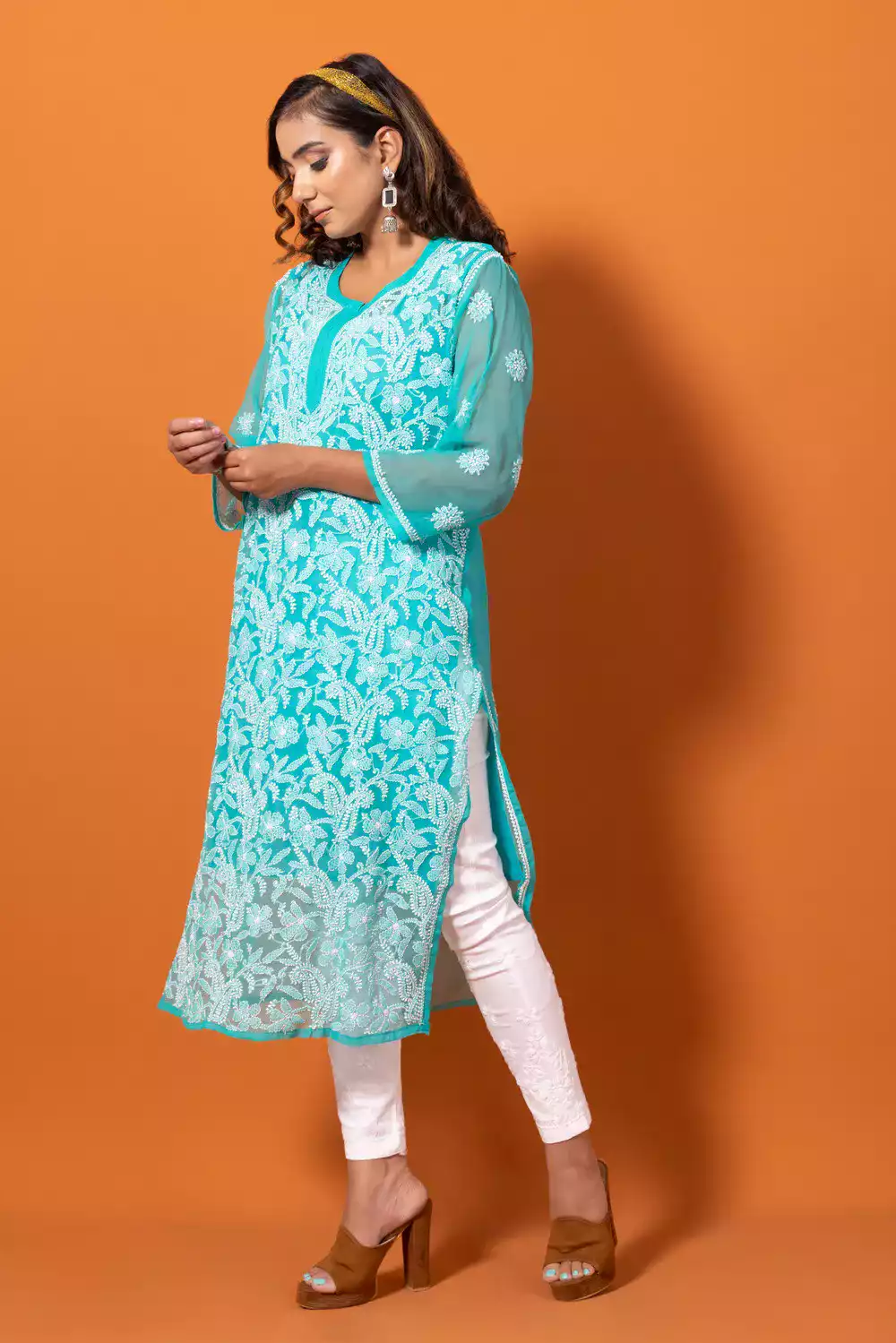 Full Jaal Kali Fox Georgette Straight Kurti comes in Sky Blue colour, with Lucknowi work Embroidery. It is 100% heavy and and hand-embroidered on the front and light work at the Back in white thread. Experience the wonder of our premium work for a classic, relaxed fit.